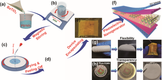 随着自驱动便携式电子设备、多能量采集器和传感器的迅速发展,柔性压电纳米发电器件由于其机电转换效率高效、响应快速,能从环境中获取能量进行发电/供电而备受关注。虽然有很多研究将压电陶瓷粉体与聚合物混合可以获得柔性压电纳米发电器件,但是自由取向的压电结构设计导致低的能量收集效率。本研究通过溶剂热软化学反应,基于拓扑化学转变机制制备了二维取向性钛酸钡多晶,将钛酸钡多晶与聚二甲基硅氧烷基质浇筑复合构建了高性能压电纳米发电器件,并利用发电器件捕获动能轻易点亮了商用LED灯组,最大输出的开路电压可达13.0V;探讨了钛酸钡多晶浓度、钛酸钡多晶/聚二甲基硅氧烷膜的极化条件、机械压力变化对压电性能的输出影响,证明了所开发压电器件在人体机械运动上的能量转化和基础应用。此外,本研究还利用多物理场耦合有限元仿真模拟,计算了压电器件在机械力下应力和压电的电势分布,对实验结果进行了有效印证并为压电器件的性能输出提供了科学的理论支撑。本研究为制造高性能、低成本的柔性压电纳米发电器件提供了新的视角,可望在柔性可穿戴设备等领域获得应用。(科研管理处、化学化工学院 文、图/周妮妮 审核/王晓玲、胡登卫)