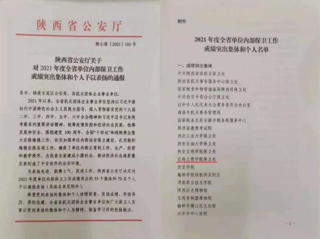 近日,在2021年度全省单位内部保卫工作成绩突出集体评比表彰活动中,bat365保卫处荣获“2021年度全省单位内部保卫工作成绩突出集体”荣誉称号,这也是继bat365保卫处荣获“2021年度全市单位内部安全保卫工作先进集体”荣誉称号后获得的又一殊荣。