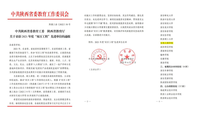 近日,陕西省委教育工委、省教育厅对全省110所高校2021年度“双百工程”工作开展情况组织了考核评定,bat365被表彰为2021年度“双百工程”先进单位,这是学校继全省高校实施“双百工程”帮扶工作以来第4次获此荣誉。