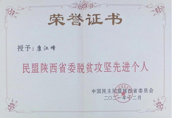 近日,民盟bat365在线中国官网登录入口总支康江峰被授予“民盟陕西省委脱贫攻坚先进个人”称号,以表彰他在全省脱贫攻坚进程中所作的贡献。同时,康江峰、王建宁两位盟员还分别荣获民盟陕西省委2021年度盟务工作“先进个人”称号。
