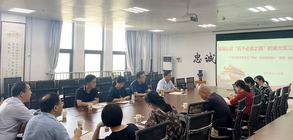 6月28日下午,马克思主义学院“原理”教研室在高新校区博文楼1201会议室开展“深刻认识‘五个必由之路’的重要意义——将习近平总书记‘两会’讲话精神融入原理课教学探讨”教研活动,校长郭霄鹏、副校长李景宜参加并指导教研活动。教研活动由教研室主任韩静主持。