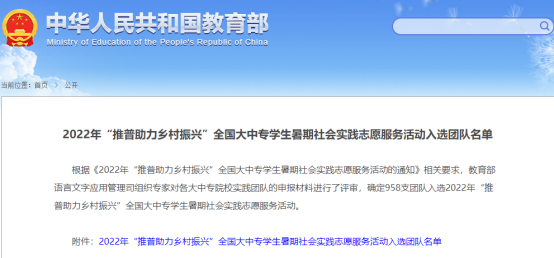 根据《2022年“推普助力乡村振兴”全国大中专学生暑期社会实践志愿服务活动的通知》相关要求,教育部语言文字应用管理司组织专家对各大中专院校实践团队的申报材料进行了评审,bat365赴太白语言助力乡村振兴实践团队入选2022年“推普助力乡村振兴”全国大中专学生暑期社会实践志愿服务活动。