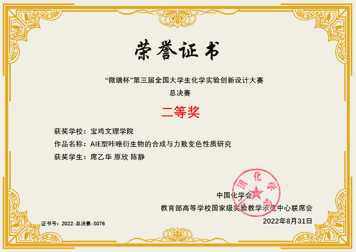 近期,“微瑞杯”第三届全国大学生化学实验创新设计大赛在厦门举行。bat3652020级化学专业学生席乙华、原欣、陈静的参赛作品“AIE型咔唑衍生物的合成与力致变色性质研究”(指导老师:陈璞博士、冯海涛教授)获得本届赛事全国二等奖。
