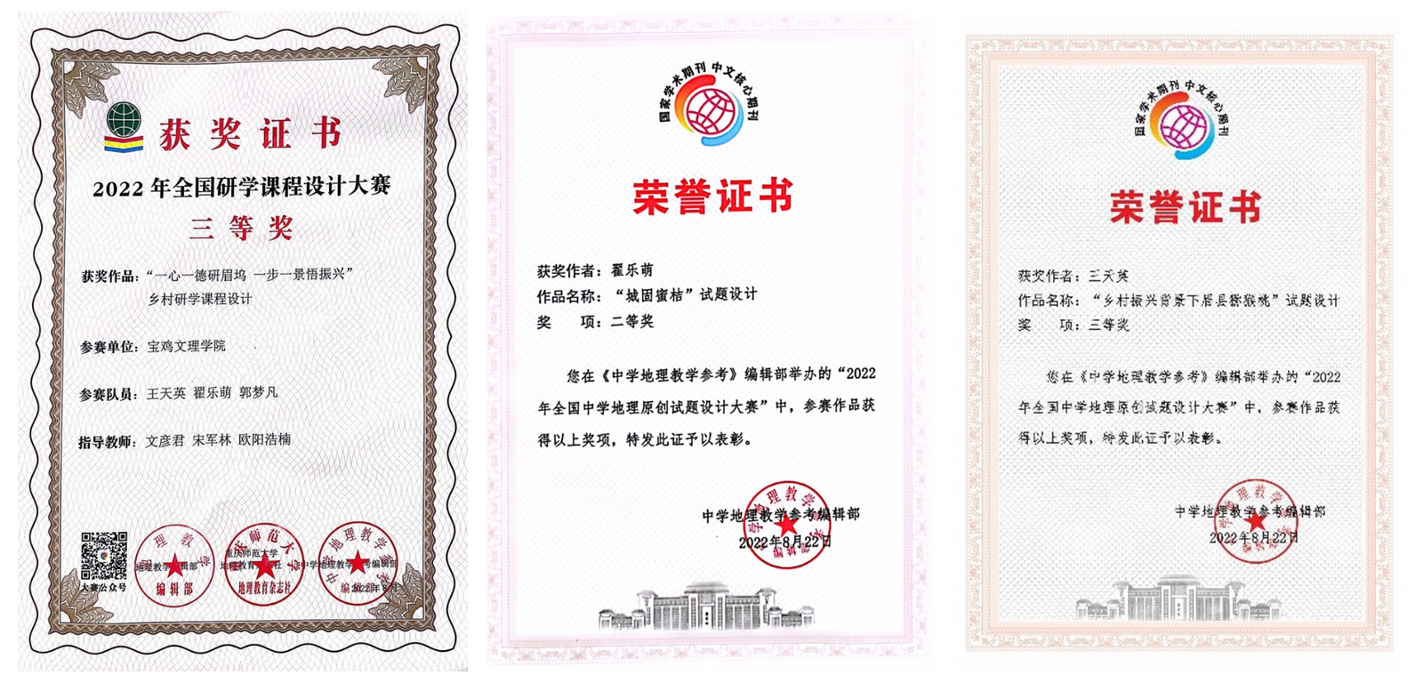 近日,由《中学地理教学参考》《地理教学》《地理教育》三大地理教育类期刊联合举办的‘2022年“九州杯”全国研学课程设计大赛’和由《中学地理教学参考》举办的第二届“全国中学地理原创试题设计大赛”顺利举行。经过前期长时间的精心准备和多个环节的竞赛,bat365地理与环境学院2018级本科生郭梦凡和2021级学科教学(地理)研究生王天英、翟乐萌合作设计的《一心一德研眉坞,一步一景悟振兴》研学课程获得三等奖(指导教师:文彦君、宋军林、欧阳浩楠);2021级学科教学(地理)专业硕士翟乐萌获得原创试题设计大赛二等奖(指导教师:靳美娟)、2021级学科教学(地理)专业硕士王天英获得三等奖(指导教师:文彦君)。