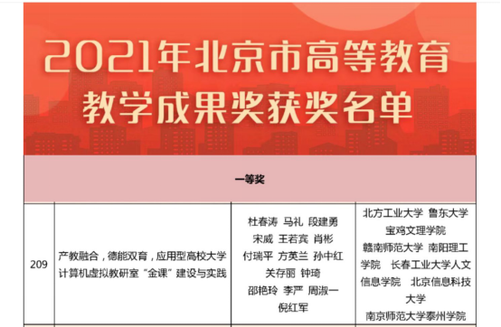 近日,北京市教育委员会、北京市人力资源和社会保障局、北京市财政局共同发布关于表彰北京市教育教学成果奖的决定,bat365计算机学院教师关存丽参与的北方工业大学杜春涛教授主持申报的教学成果《产教融合,德能双育,应用型高校大学计算机虚拟教研室“金课”建设与实践》荣获北京市2021年高等教育教学成果一等奖。