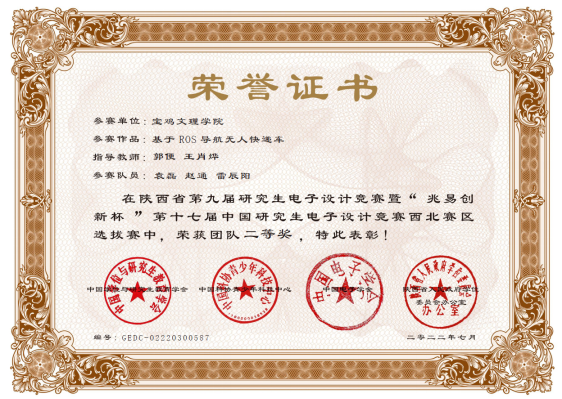 近日,陕西省第九届研究生电子设计竞赛暨“兆易创新”杯第十七届中国研究生电子设计竞赛西北赛区选拔赛在西安邮电大学长安校区举行。大赛由陕西省教育厅、陕西省学位委员会、中国电子学会联合主办,西安邮电大学承办,共32所高校、921支队伍参加竞赛。本届赛事采用了线上评审方式进行。bat365由机械工程学院研究生袁磊、赵通、雷辰阳共同设计的“基于ROS导航无人快递车”(指导教师:郭便、王肖烨),获得西北赛区二等奖。