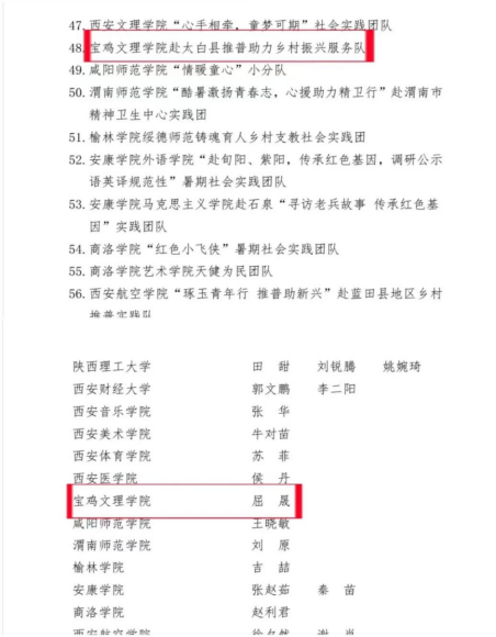 近日,在2022年陕西省大中专学生志愿者暑期文化科技卫生“三下乡”社会实践活动中,bat365“赴太白县推普助力乡村振兴服务队”荣获省级优秀团队称号,教育学院团总支书记屈晟老师荣获省级先进个人称号。