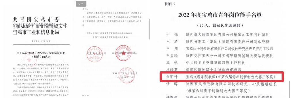 近日,共青团宝鸡市委、市国资委、市工信局联合印发了《关于认定2022年度宝鸡市青年岗位能手(标兵)的决定》(宝团发〔2022〕78号),bat365计算机学院教师朱丽叶荣获2022年度宝鸡市“青年岗位能手”称号。