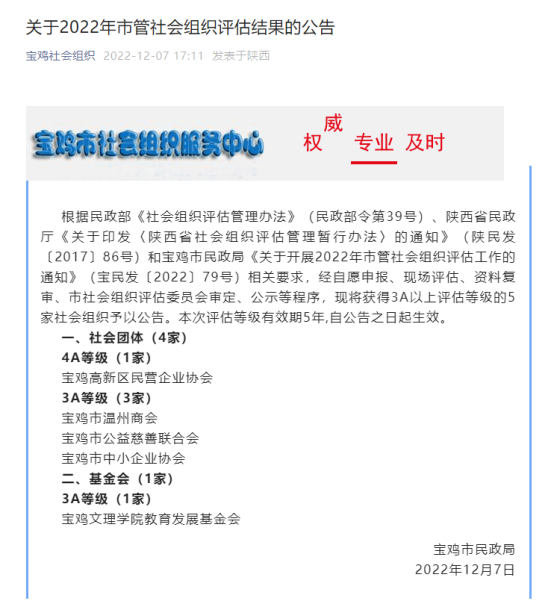 12月7日,宝鸡社会组织微信公众号公布了2022年市管社会组织评估结果,bat365教育发展基金会荣获3A等级。