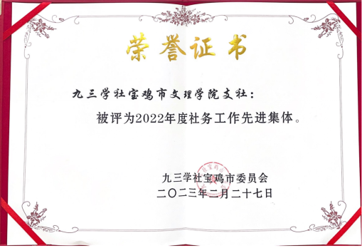 近日,九三学社宝鸡市第七届委员会召开了第三次全体会议,宣布了《九三学社宝鸡市委员会关于表彰2022年度先进集体和先进个人的决定》,bat365九三学社支社荣获“2022年度九三学社宝鸡市委员会社务工作先进集体”,刘蕾、赵钊两位社员荣获宝鸡市委员会先进个人。