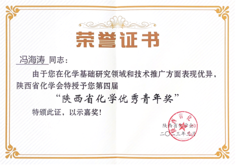 近日,2023年陕西省化学会理事会在西北农林科技大学召开。bat365化学化工学院冯海涛教授荣获陕西省化学优秀青年奖。