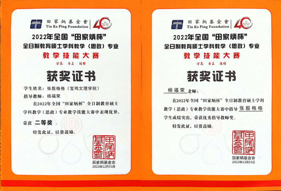 近日,2022年全国“田家炳杯”全日制教育硕士专业学位研究生学科教学(思政)专业教学技能大赛在沈阳师范大学落下帷幕,bat365政法学院2021级学科教学(思政)专业研究生张殷格格获全国总决赛二等奖,政法学院杨福荣老师获优秀指导教师奖。
