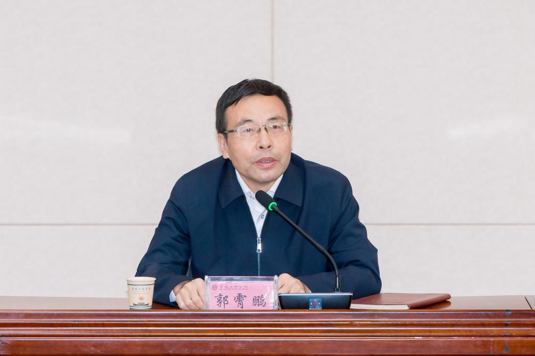 郭霄鹏对办好读书班提出四点要求:一是讲政治、强党性,切实把理论学习作为一项重要政治任务抓紧抓好。要充分认识举办主题教育读书班、开展集中学习和专题研讨的重要意义,坚持不懈用习近平新时代中国特色社会主义思想凝心铸魂;深刻把握思想建党、理论强党的重要性,进一步强化思想自觉,静下心来学习、沉下心来思考,深入基层调研、认真研讨交流,全面增强理论学习的自觉性和紧迫感。二是读原著、悟原理,切实把学懂弄通做实习近平新时代中国特色社会主义思想作为根本任务。要原原本本学、认认真真学,读原著学原文悟原理;坚持通读与分章节重点研读相结合,个人自学与集体研讨相结合,切实做到精深研读、系统思考,不断增强对党的价值追求和前进方向的高度政治认同。三是转作风、求实效,不断推动全校党员干部理论学习走深走实。要把读书班作为全校党员干部进一步转变学风和作风的重要契机,着力在增强党性上求实效、在提高能力上求实效、在改进作风上求实效、在推动工作上求实效。四是抓关键、抓重点,确保主题教育各项工作高质量高标准扎实推进。各级领导班子成员要以上率下、作出表率,牢牢把握“学思想、强党性、重实践、建新功”的总要求,以学铸魂、筑牢政治忠诚,以学增智、提高能力本领,以学正风、树立良好形象,以学促干、加快推动发展。他强调,全体学员要珍惜学习机会,严格遵守学习纪律,大力弘扬马克思主义优良学风,坚持理论联系实际,把主题教育与更名大学、“双一流”建设、本科教育教学审核评估、建校65周年、专业认证等中心工作、重点工作结合起来,与干部作风能力提升年、清廉学校建设、大兴调查研究等活动结合起来,全力推动学校各项事业高质量发展破局突围、追赶进位。