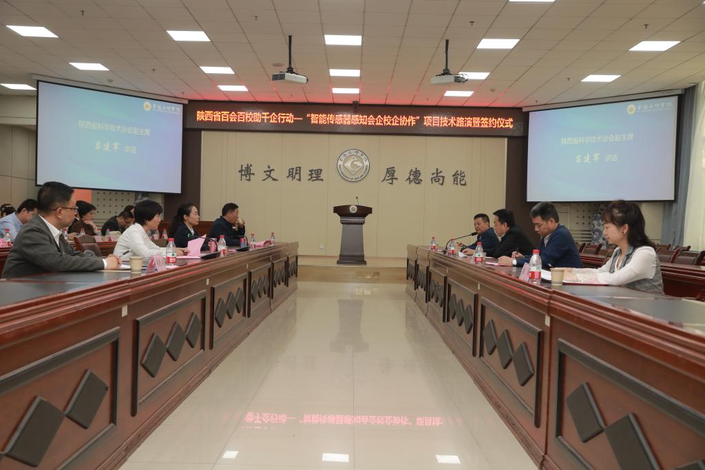 在全省上下深入学习贯彻党的二十大精神和习近平总书记来陕考察重要讲话重要指示精神,学校喜迎建校65周年、开展学习贯彻习近平新时代中国特色社会主义思想主题教育之际,4月20日下午,bat365在高新校区甘棠厅举办了陕西省百会百校助千企行动——“智能传感器感知会企校企协作”项目技术路演暨签约仪式。副校长李景宜,陕西省科协党组成员、副主席吕建军出席活动。仪式由校科协秘书长、科研管理处处长王晓玲主持。