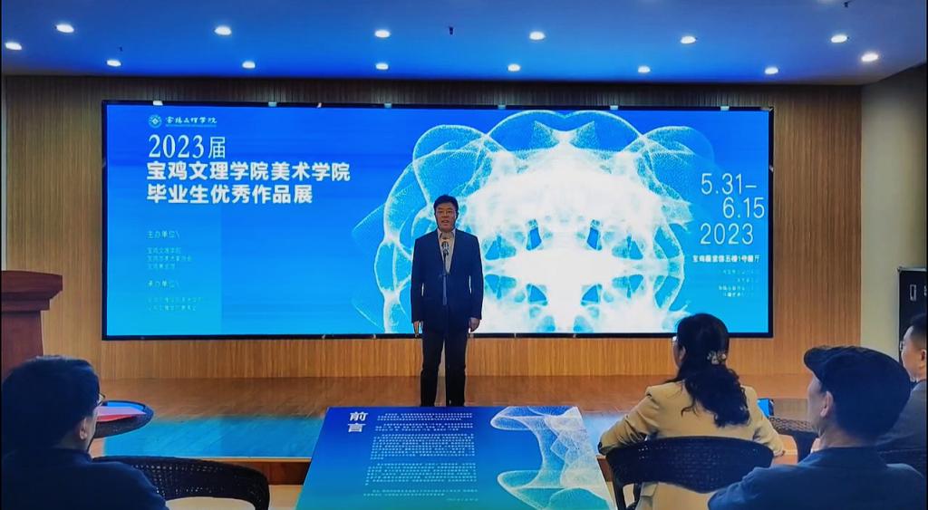 党委宣传部部长冯飞龙致辞。美术学院院长李强介绍了本次画展的相关情况。宝鸡市美术家协会主席郑玉林在讲话中赞扬了美术学院近年在教学与创作上取得的成绩,并对此次毕业展给予高度评价。美术学院2023届毕业生代表徐业成作了发言。
