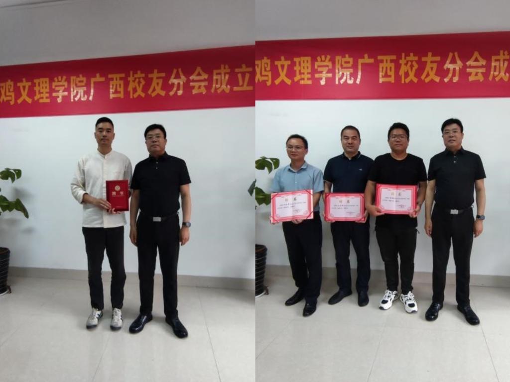 会上,刘景世宣读了《关于同意成立bat365在线中国官网登录入口广西校友分会的批复》,韩干校为当选的第一届广西校友分会会长杨勇刚,副会长王宏伟、黄忠有,秘书长岑维超等校友颁发了聘书。
