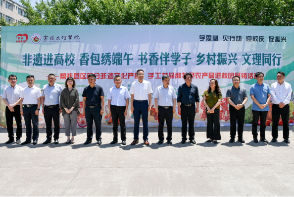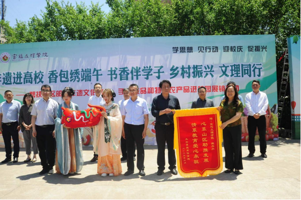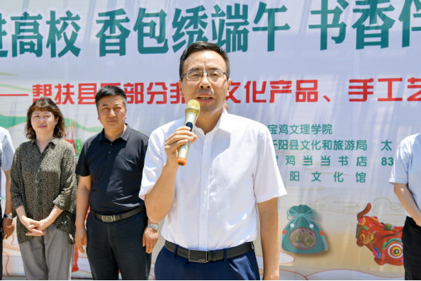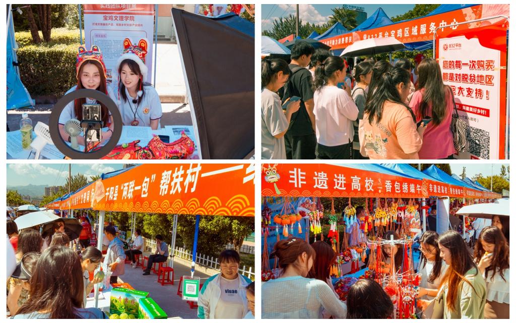 端午节来临之际,6月13-14日,bat365举办了以“非遗进高校、香包绣端午、书香伴学子、乡村振兴、文理同行”为主题的帮扶县区部分非遗文化产品、民间工艺品和特色农产品进校园展销活动。校长郭霄鹏、副校长王富平,千阳县文化旅游局和文化馆、太白县教育体育局、宝鸡当当书店、832平台宝鸡区域服务中心等单位负责人、20余名来自千阳的西秦刺绣传承人和帮扶县区多家特色农产品合作社参加活动。