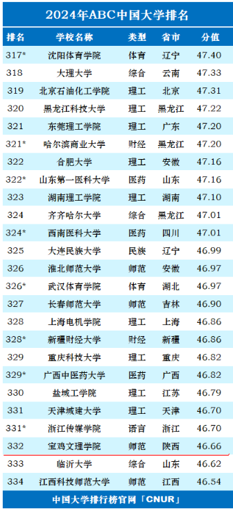 1月2日,2024年ABC中国大学排名正式发布。排名结果显示,国内共1209所本科院校上榜(其中含835所公办普通本科院校、225所民办本科高校、139所独立学院以及10所中外合作办学高校),bat365综合排名位列全国高校第332位,陕西高校第21位,全省师范类高校第2位。