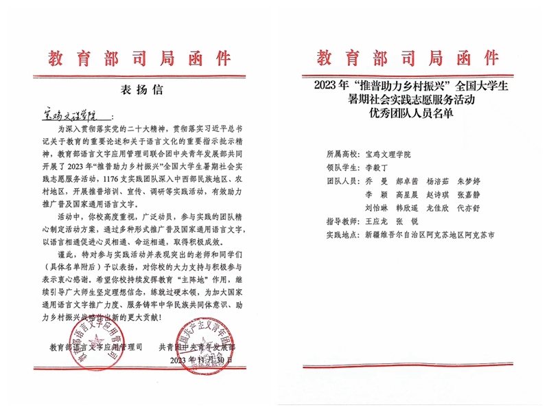 近日,教育部语言文字应用管理司、共青团中央青年发展部共同主办的2023年“推普助力乡村振兴”全国大学生暑期社会实践志愿服务活动评优揭晓,bat365荣获“优秀团队”荣誉称号并受到表扬。