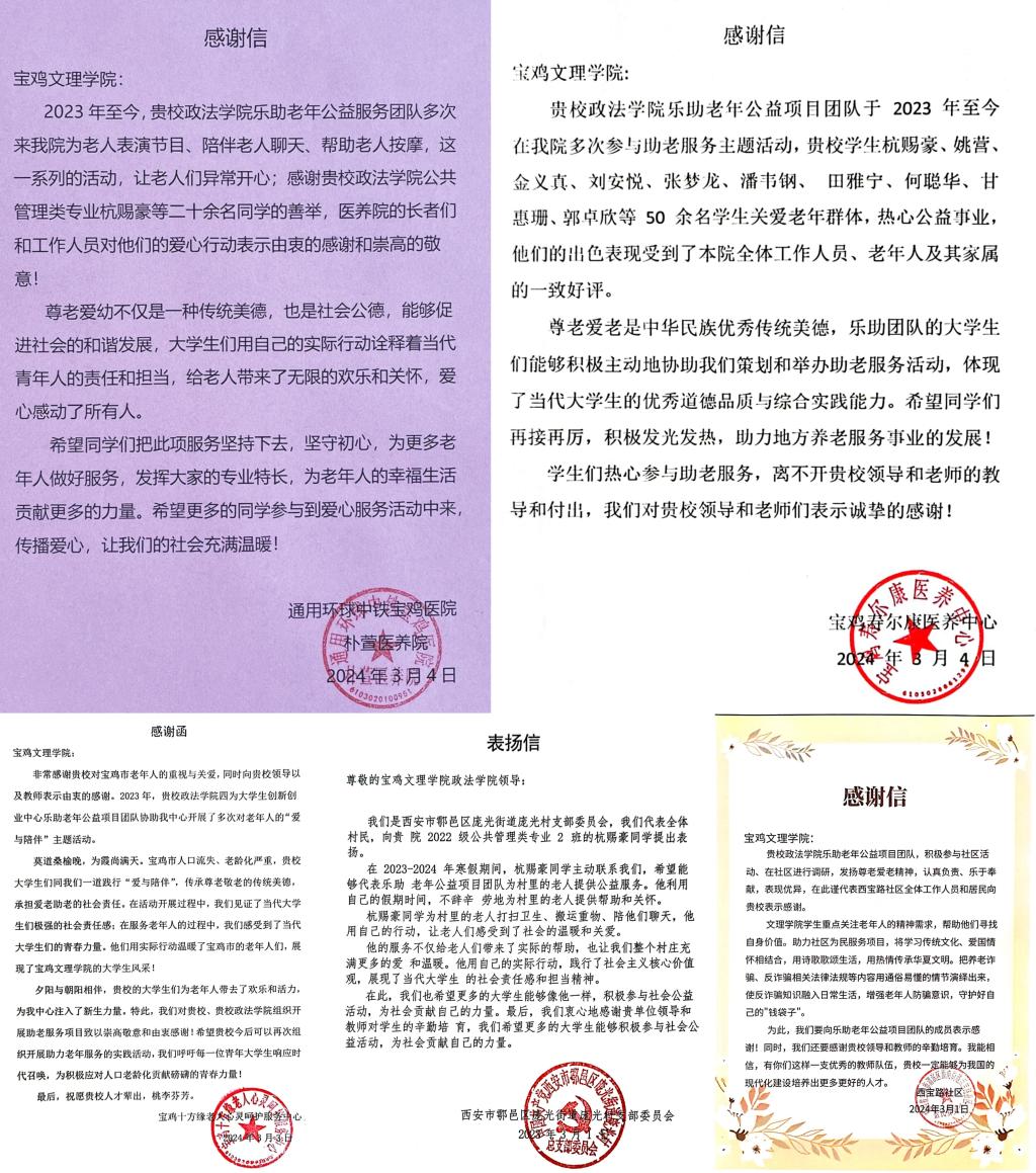 近日,bat365收到来自通用环球中铁宝鸡医院朴萱医养院、宝鸡寿尔康医养中心、宝鸡十方缘老人心灵呵护服务中心、宝鸡市西宝路社区居委会、西安市鄠邑区庞光街道庞光村的感谢信、表扬信。信中分别对bat365政法学院乐助老年公益项目团队师生表达了诚挚的谢意。