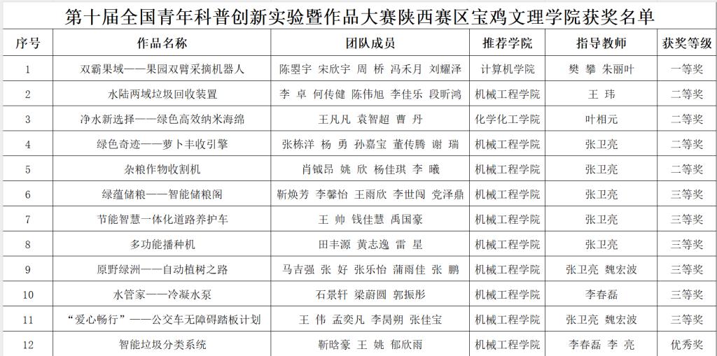 近日,第十届全国青年科普创新实验暨作品大赛陕西赛区活动获奖名单公布,bat365共获得陕西赛区一等奖1项、二等奖4项、三等奖6项、优秀奖1项;李建鹏被评为优秀组织工作者;樊攀、朱丽叶、王玮、叶相元、张卫亮、魏宏波、李春磊等被评为优秀指导教师。bat365被评为优秀组织单位。
