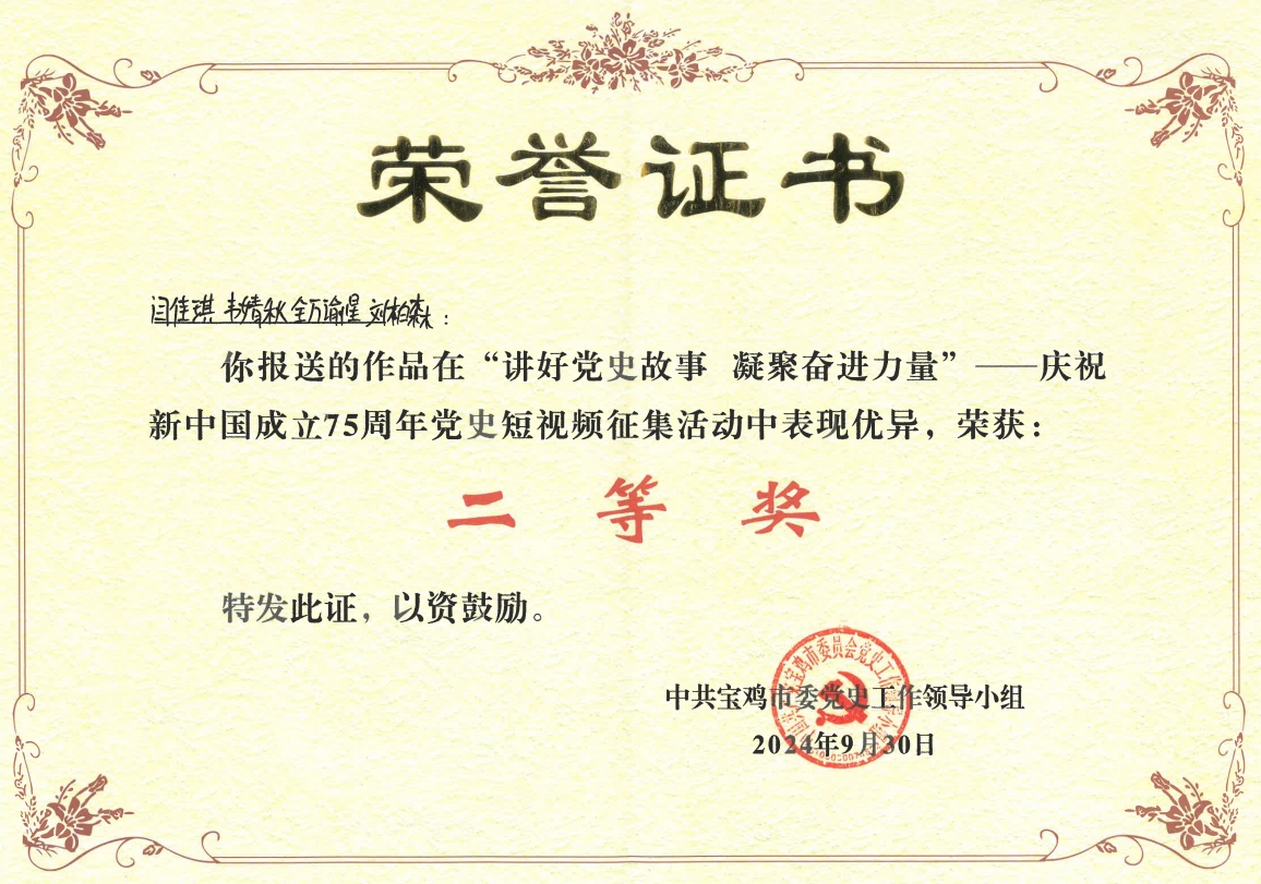 近日,由中共宝鸡市委主办的“讲好党史故事 凝聚奋进力量”——庆祝新中国成立75周年党史短视频征集活动获奖作品集中展播暨颁奖仪式在恒源酒店举行。由党委宣传部、文学与新闻传播学院联合制作的短视频《不朽的丰碑》荣获二等奖。