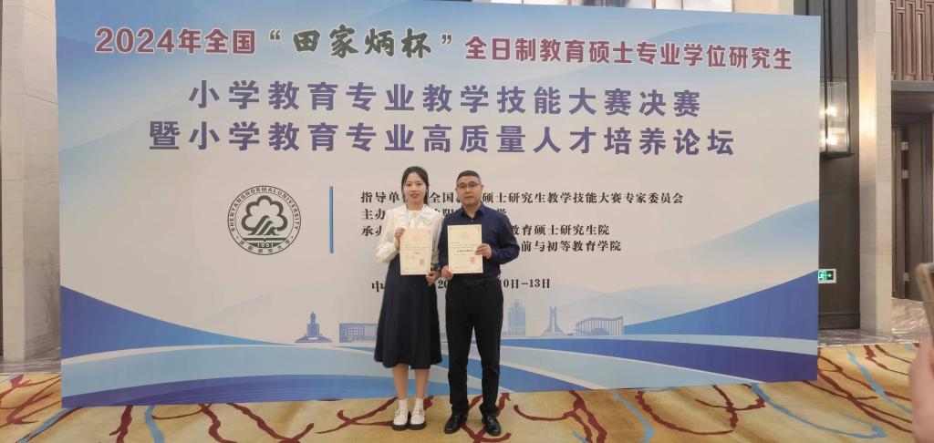 近日,2024年全国“田家炳杯”全日制教育硕士专业学位研究生小学教育专业教学技能大赛决赛暨小学教育专业高质量人才培养论坛在沈阳师范大学举行。bat365教育学院2023级小学教育专业研究生薛琛获全国二等奖、李存生获优秀指导教师称号。