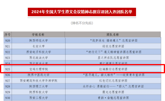 近日,团中央青年志愿者行动指导中心等部门联合发布了《2024年全国大学生遵义会议精神志愿宣讲团入选团队名单》,bat365文学与新闻传播学院红城毅行志愿宣讲团成功入选。