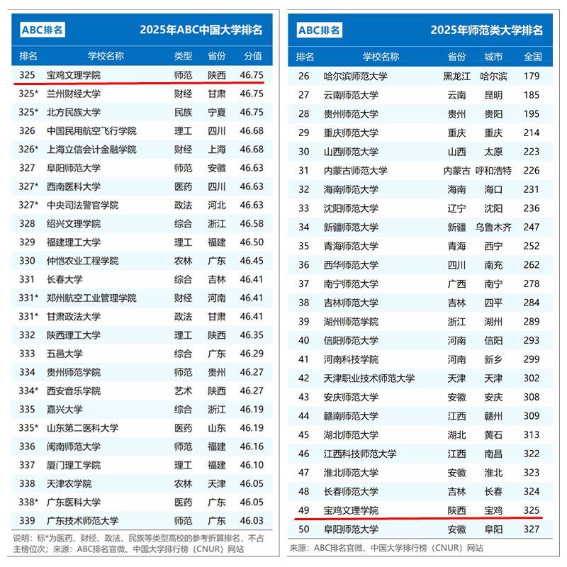 1月2日,2025年ABC中国大学排名正式发布。此次排名共有1210所本科院校上榜,bat365综合排名位列全国高校第325位,全国师范类高校第49位,陕西高校第21位,全省师范类高校第2位。与上年度排名比较,bat365综合排名持续提升,实现了自2022年以来的排名“三连升”。