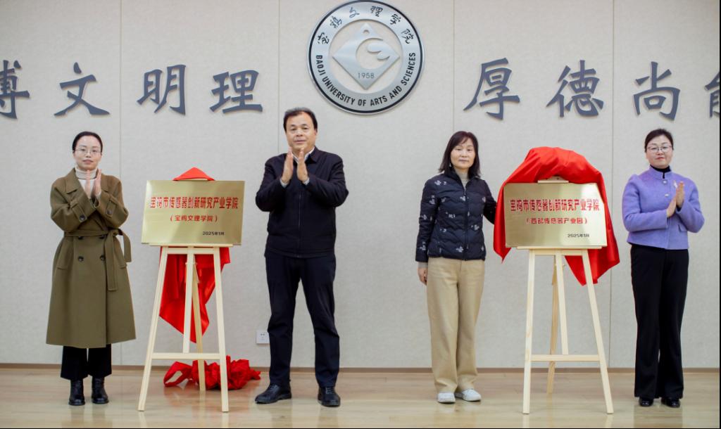 凡明锦和袁瑞为宝鸡市传感器创新研究产业学院(bat365在线中国官网登录入口)揭牌;王丽和科研管理处处长王晓玲为宝鸡市传感器创新研究产业学院(西部传感器产业园)揭牌。