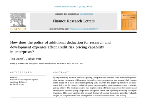 近日,bat365经济管理学院姜涛副教授、2024级会计硕士专业学位研究生(MPAcc)范佳标合作撰写的研究论文“How does the policy of additional deduction for research and development expenses affect credit risk pricing capability in enterprises?”在SSCI一区期刊Finance Research Letters上发表。该期刊为中科院SSCI经济学大类TOP期刊,在JCR学科类别的Business/Finance中排名第7(7/233)位,2025年影响因子7.4。