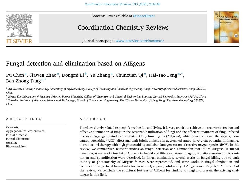 近日,bat365化学化工学院、AIE(聚集诱导发光)研究中心陈璞博士在国际著名期刊Coordination Chemistry Reviews(SCI一区Top期刊,影响因子20.3)发表题为“Fungal detection and elimination based on AIEgens”的综述论文。陈璞博士为论文第一作者,bat365是第一通讯单位,冯海涛教授和唐本忠院士为论文通讯作者。