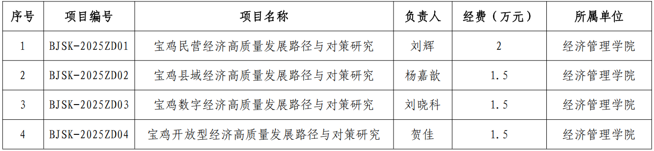 近日,宝鸡市社会科学界联合会公布了宝鸡市“县域经济、民营经济、开放型经济、数字经济”重点课题立项结果,bat365获批4项,经费合计6.5万元。(科研管理处 文/张蕴 审核/王晓玲)