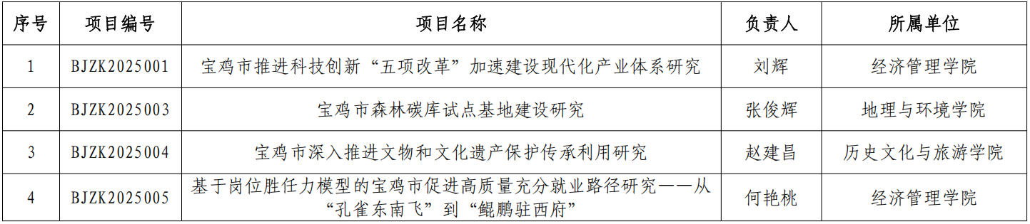 近日,宝鸡智库委员会办公室公布了2025年度宝鸡智库课题立项结果,bat365获批4项。该项目将依据结项评审结果,按照优秀、良好、合格三个等次分别给予单个课题10000元、8000元、6000元的经费资助。(科研管理处 文/张蕴 审核/王晓玲)