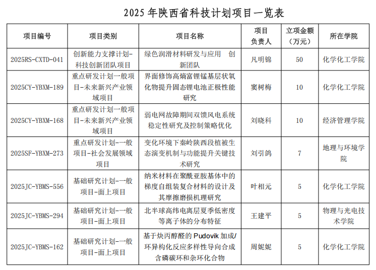 近日,陕西省科学技术厅公布了2025年度陕西省科技计划项目评审结果,bat365获批27项,立项总经费188万元。