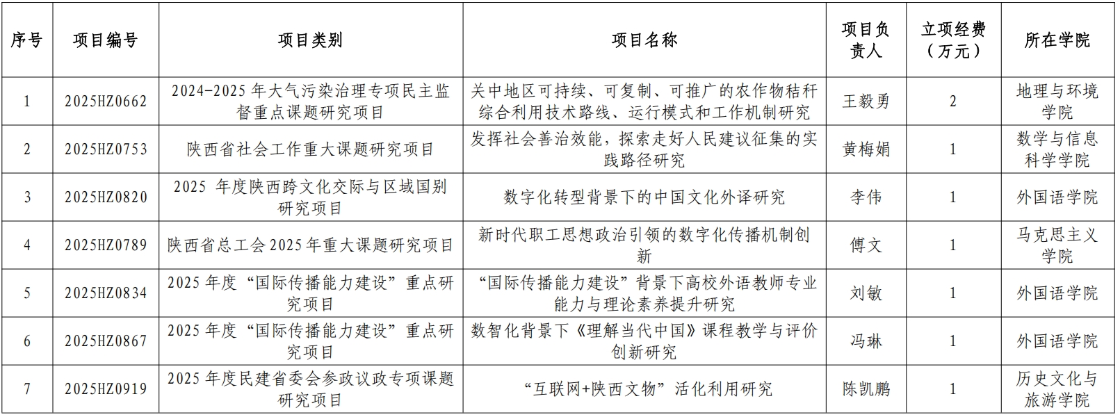 近日,陕西省社会科学界联合会陆续公布了“2024-2025年大气污染治理专项民主监督重点课题研究项目”“陕西省社会工作重大课题研究项目”“2025年度陕西跨文化交际与区域国别研究项目”“陕西省总工会2025年重大课题研究项目”“2025年度‘国际传播能力建设’重点研究项目”“2025年度民建省委会参政议政专项课题研究项目”等专项项目立项名单,bat365获批7项,资助经费共8万元。(科研管理处 文/张蕴 审核/王晓玲)
