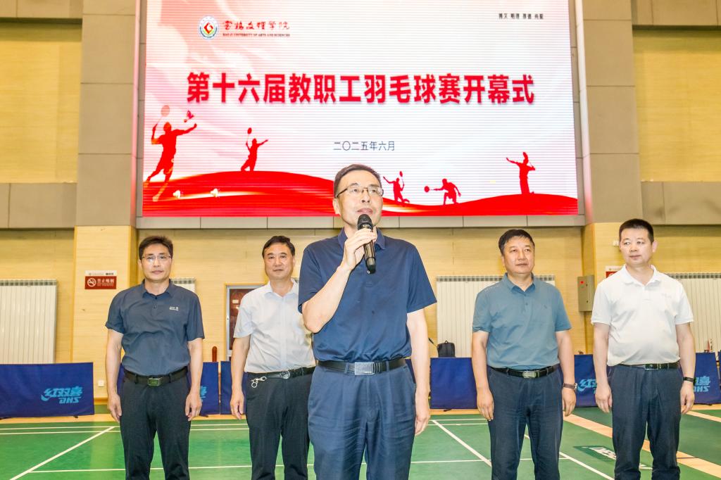 为推动校园体育文化建设,丰富教职工业余生活,6月10日至13日,学校第十六届教职工羽毛球赛在高新校区体育馆举办。校党委书记郭霄鹏出席开幕式并宣布开赛,副校长冯飞龙在开幕式上致辞。