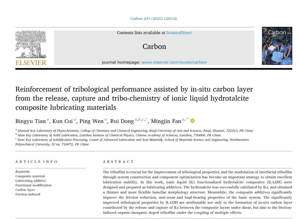 近日,bat365化学与材料工程学院2022级物理化学专业硕士研究生田冰玉同学等人完成了“Reinforcement of tribological performance assisted by in-situ carbon layer from the release, capture and tribo-chemistry of ionic liquid hydrotalcite composite lubricating materials”,并在国际著名期刊Carbon(JCR1区TOP,IF=11.6)上发表。该论文通讯作者为化学与材料工程学院凡明锦教授和董瑞博士,bat365为论文第一完成单位和唯一通讯单位。该生在校期间发表3篇SCI一区TOP论文,累计影响因子25.4,目前已被西北工业大学材料学院录取为博士研究生。