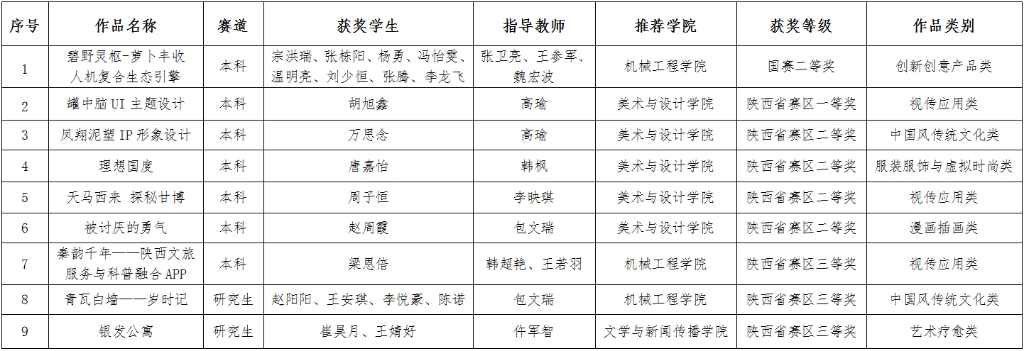 学校高度重视赛事组织工作,校赛由教务处主办、美术与设计学院承办,经过校内作品征集、评审,选拔推荐优秀作品参加陕西赛区比赛和全国总决赛,取得了良好的成绩。此次获奖是对参赛师生辛勤付出的肯定,也是学校推进创新人才培养的成果体现。(教务处、研究生院、美术与设计学院 文/张小慧 审核/周喜华、王肖烨、李强)