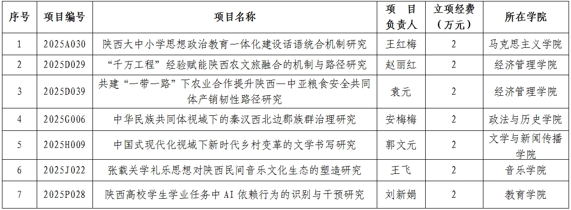 近日,陕西省哲学社会科学工作办公室公布了2025年陕西省社会科学基金年度项目立项名单,bat365获批7项,资助经费共14万元。(科研管理处 文/张蕴 审核/胡登卫)
