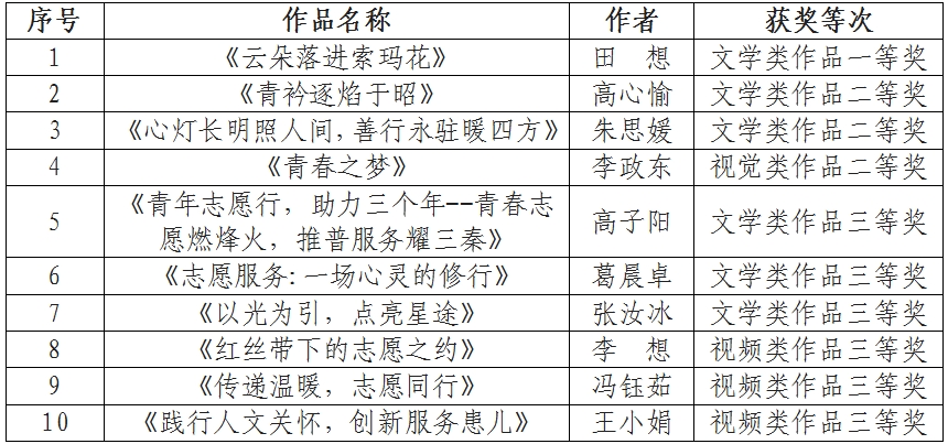本次活动由陕西省青年志愿者协会主办,以“青春志愿行,助力三个年”为主题,面向全省高校学生征集志愿服务相关的文学、视觉作品。经过综合评审,全省共评选出一等奖4项、二等奖8项、三等奖16项。