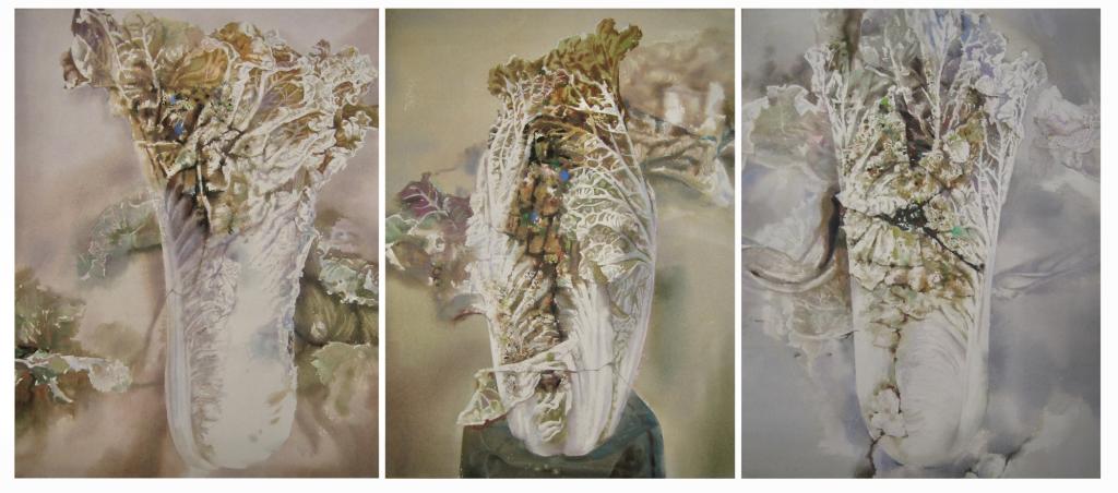 作品《人间有味是清欢》采用白菜素雅的色彩与组合造型,通过作者主观的构图和对水彩媒介氤氲特质的操控,表达人间弥漫的烟火气,在物质过剩的时代,提醒人们关注精神世界的丰盈,于平凡中发现诗意。
