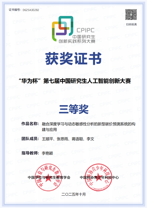 近日,“华为杯”第七届中国研究生人工智能创新大赛全国总决赛在山东青岛举行。bat365参赛作品《融合深度学习与动态敏感性分析的新型碳价预测系统的构建与应用》《初心向红——国内首个基于飞桨的少儿红色教育变装智能体》获三等奖,实现了bat365在中国研究生创新实践系列大赛中国家级奖项的历史性突破。