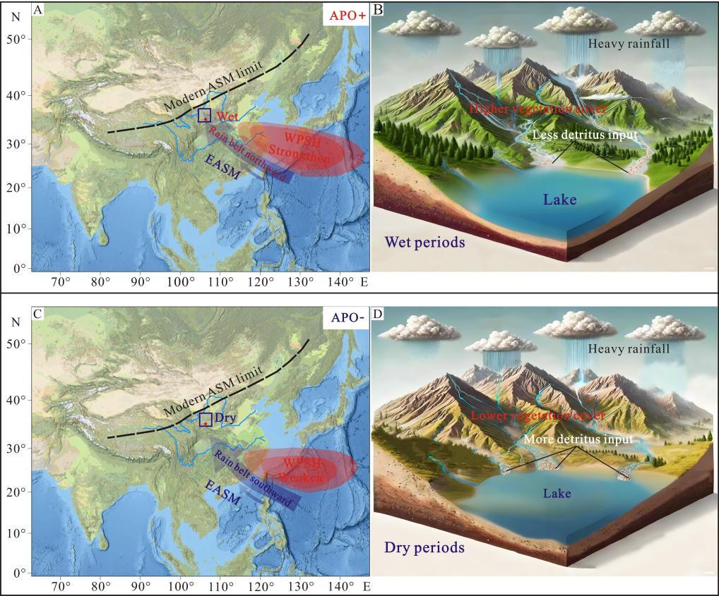 中国黄土高原小流域侵蚀的内部反馈模式与外部驱动机制一直是备受关注的热点问题,基于现代观测数据的研究时间尺度有限,而淤地坝因修建时间以及沉积物指标的局限性,不仅缺乏长时段环境背景的刻画,也难以重建植被、气候等环境要素的变化。本研究利用六盘山朝那湫湖泊沉积物重建了黄土高原西部过去300年的高分辨率小流域土壤侵蚀、气候变化和植被覆盖历史。论文揭示了黄土高原小流域土壤侵蚀主要由洪水事件和高强度降雨造成,并且受植被覆盖度和年降水量控制;提出了黄土高原小流域土壤侵蚀的内部反馈模式:在十年/数十年尺度上,气候湿润(干旱),降水量增加(减少),植被覆盖度升高(降低),直接削弱(间接增强)了暴雨或洪水事件对地表土壤的侵蚀强度。另外,亚洲-太平洋涛动(APO)通过调节东亚夏季风(EASM)强度来影响区域降水与植被覆盖,进而调控了区域的土壤侵蚀信号。本文强调了地球气候系统内部变率在控制区域十年/数十年尺度上土壤侵蚀信号中的关键作用。
