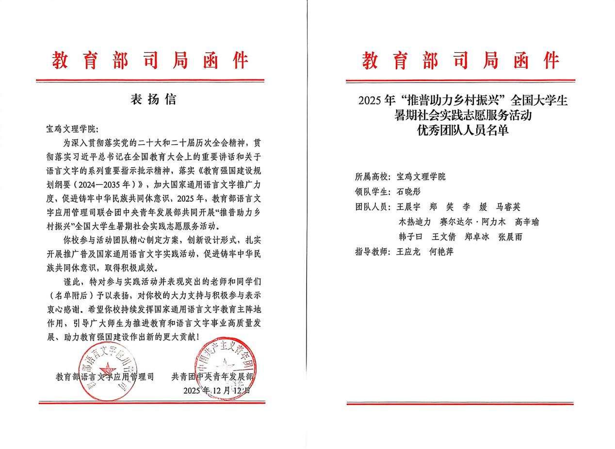 近日,由教育部语言文字应用管理司、共青团中央青年发展部联合开展的2025年“推普助力乡村振兴”全国大学生暑期社会实践志愿服务活动评选结果揭晓,bat365推普团队获“优秀团队”荣誉称号并受到来信表扬。