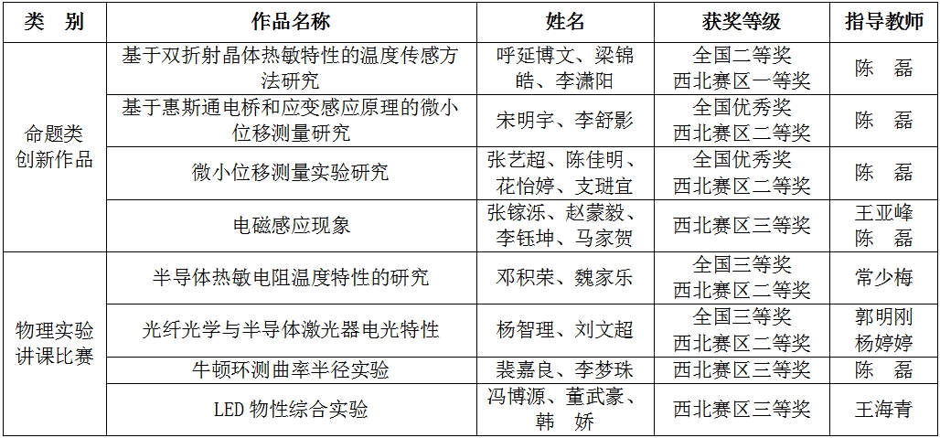 全国大学生物理实验竞赛(创新)是“全国普通高校大学生竞赛排行榜”赛事之一,旨在激发学生对大学物理实验课程的学习兴趣和学习潜能,提高物理实验教学质量和高素质、创新型人才培养质量。本届比赛由高等学校国家级实验教学示范中心联席会物理学科组、教育部高等学校大学物理课程教学指导委员会、教育部高等学校物理学类专业教学指导委员会和中国物理学会物理教学委员会指导,全国大学生物理实验竞赛组委会和全国高等学校实验物理教学研究会主办。国赛由中南大学承办,西北赛区比赛由陕西师范大学承办。