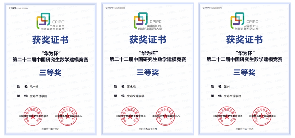 近日,“华为杯”第二十二届中国研究生数学建模竞赛获奖结果正式公布。bat365数学与信息科学学院2024级硕士研究生毛一鸣、黎永杰、强兴组成的参赛团队,凭借扎实的数学建模能力、高效的团队协作与创新的问题解决思路脱颖而出,获国赛三等奖。李艳颖教授为该团队的指导教师。