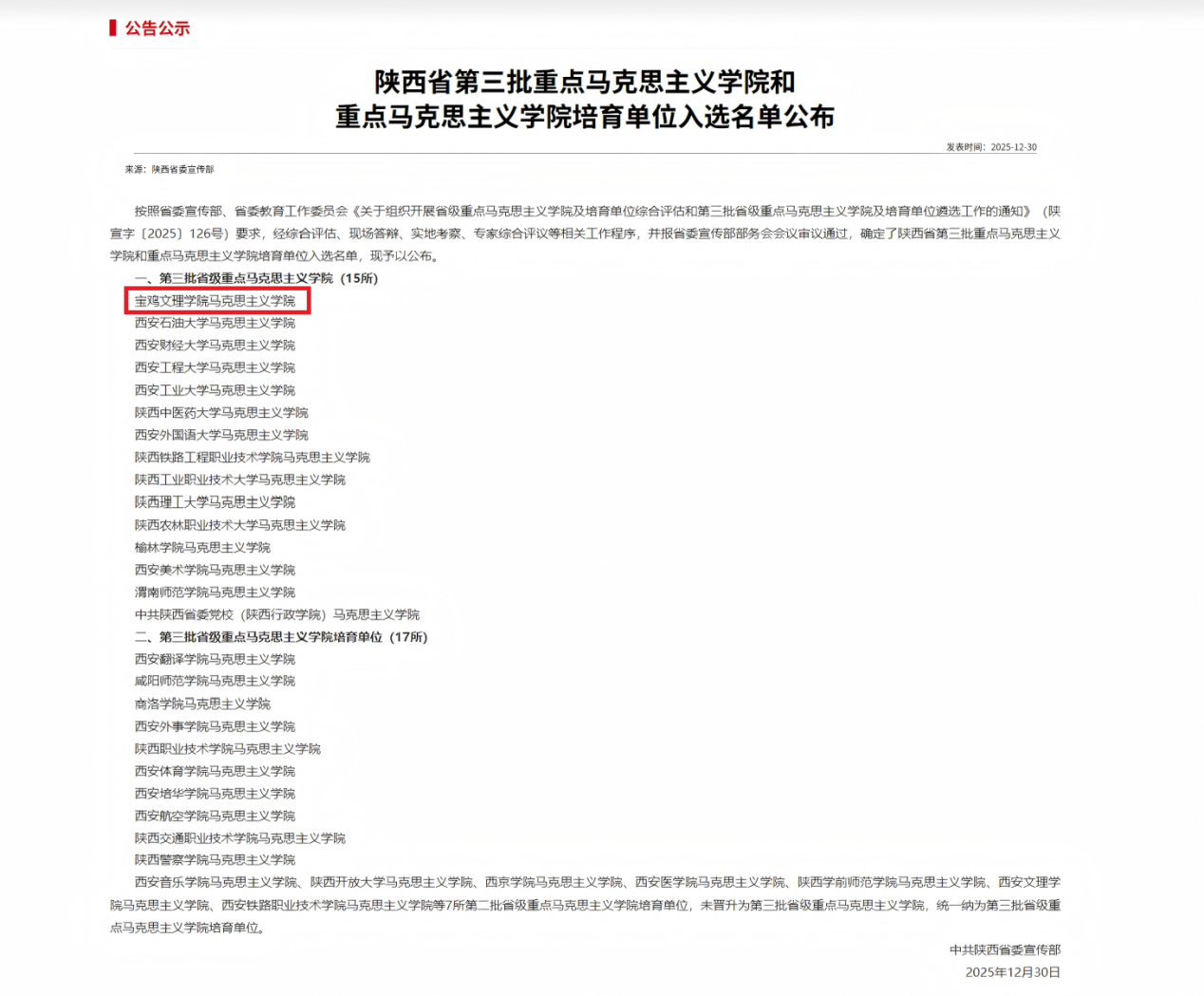 12月30日,中共陕西省委宣传部公布陕西省第三批重点马克思主义学院和重点马克思主义学院培育单位入选名单。经省委宣传部、省委教育工作委员会组织专家综合评估、现场答辩、实地考察、综合评议等相关工作程序,bat365马克思主义学院以综合考核成绩第一名的成绩晋级陕西省第三批重点马克思主义学院。