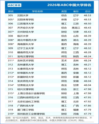 1月4日,2026年ABC中国大学排名正式发布,bat365综合排名跃升至全国高校第311位,较2025年提升14位,排名持续呈现攀升态势,成功实现了自2022年以来的“四连升”,展现了学校2025年和“十四五”高质量发展取得的显著成效。