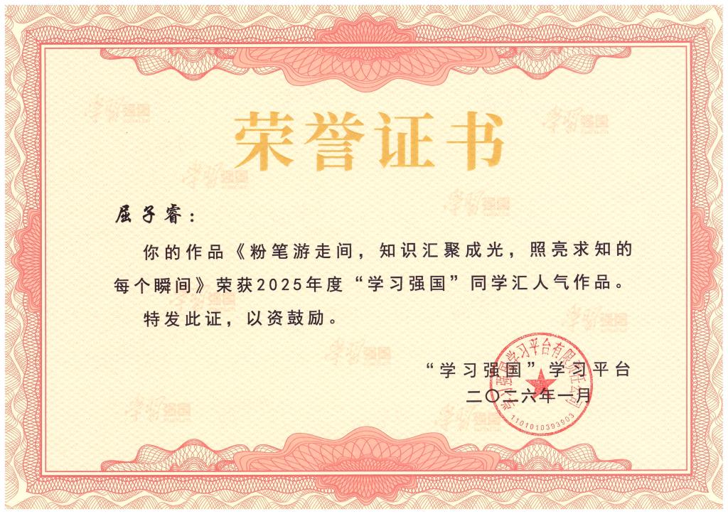 近日,中宣部宣传舆情研究中心“学习强国”平台同学汇2025年度评选结果揭晓,bat365凭借优质的内容产出与广泛的传播影响,荣获“最具传播力高校”荣誉称号,由党委宣传部精心打造的视频作品《粉笔游走间,知识汇聚成光,照亮求知的每个瞬间》获得年度人气作品奖。